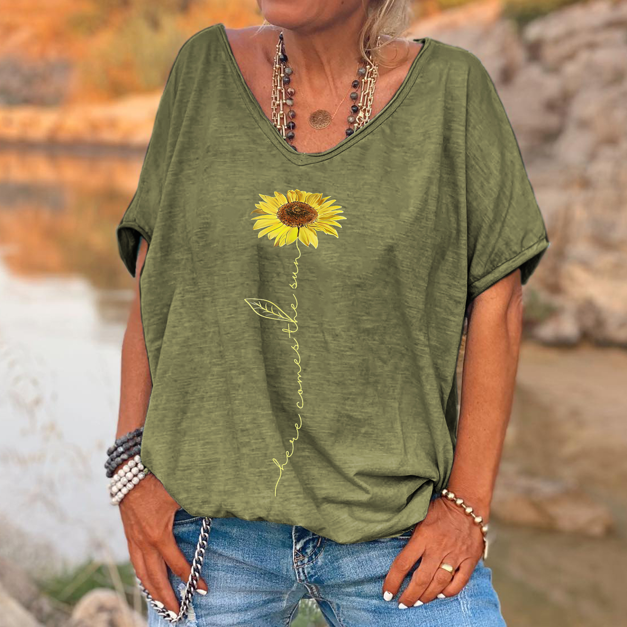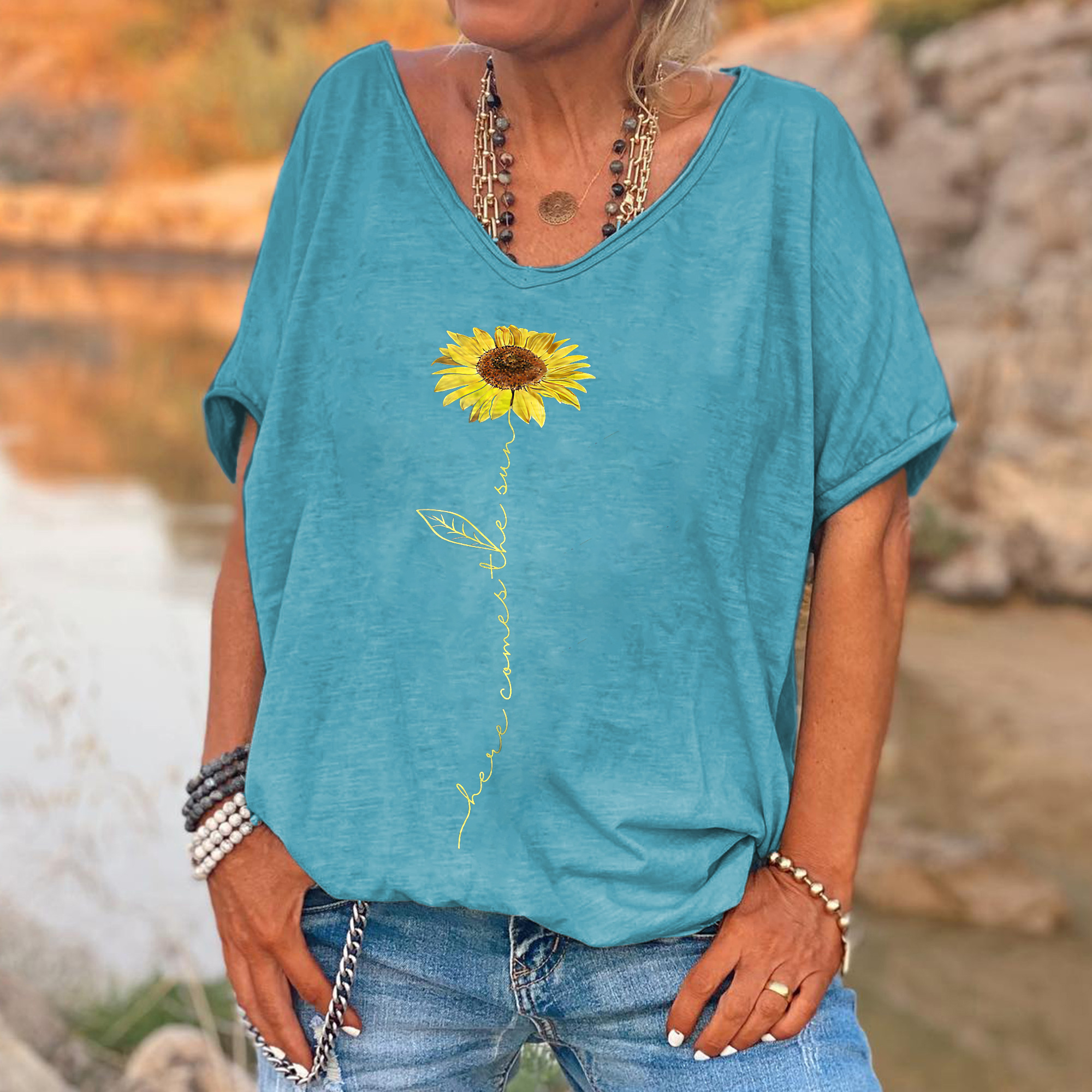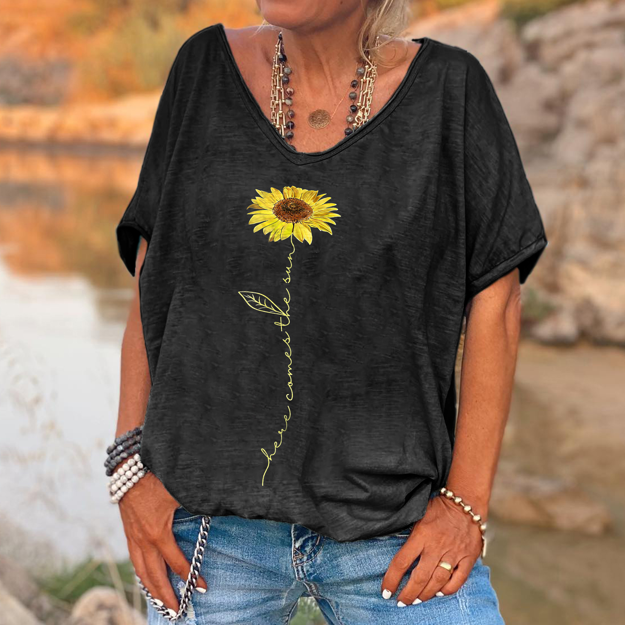 | Product Name | Here Comes The Sun Printed Sunflower T-shirt | ||